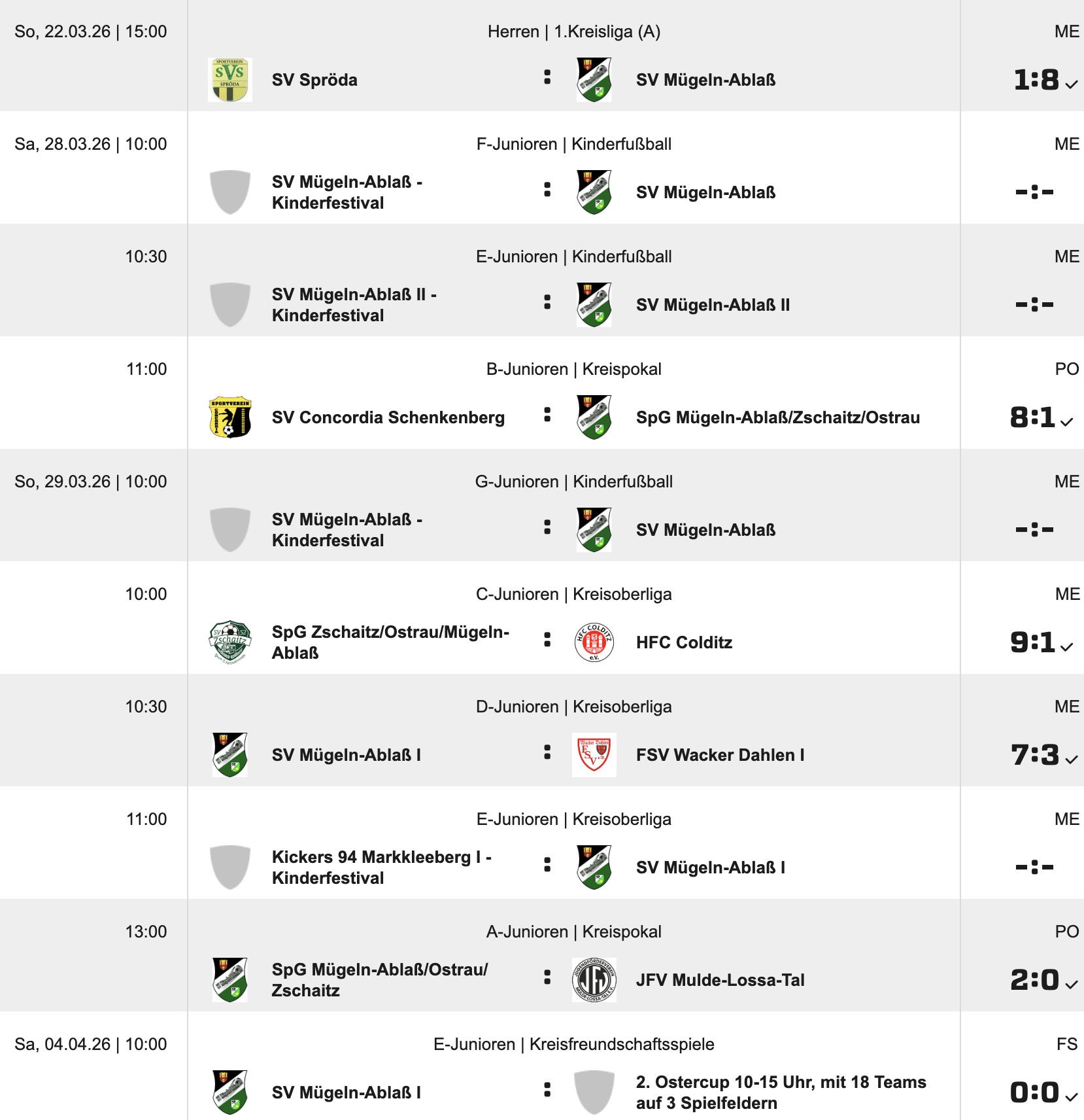 | 18. Spieltag | Sa, 08.03.25 | 15:00 | LSG Löbnitz | SV Mügeln-Ablaß | 3 : 2 |